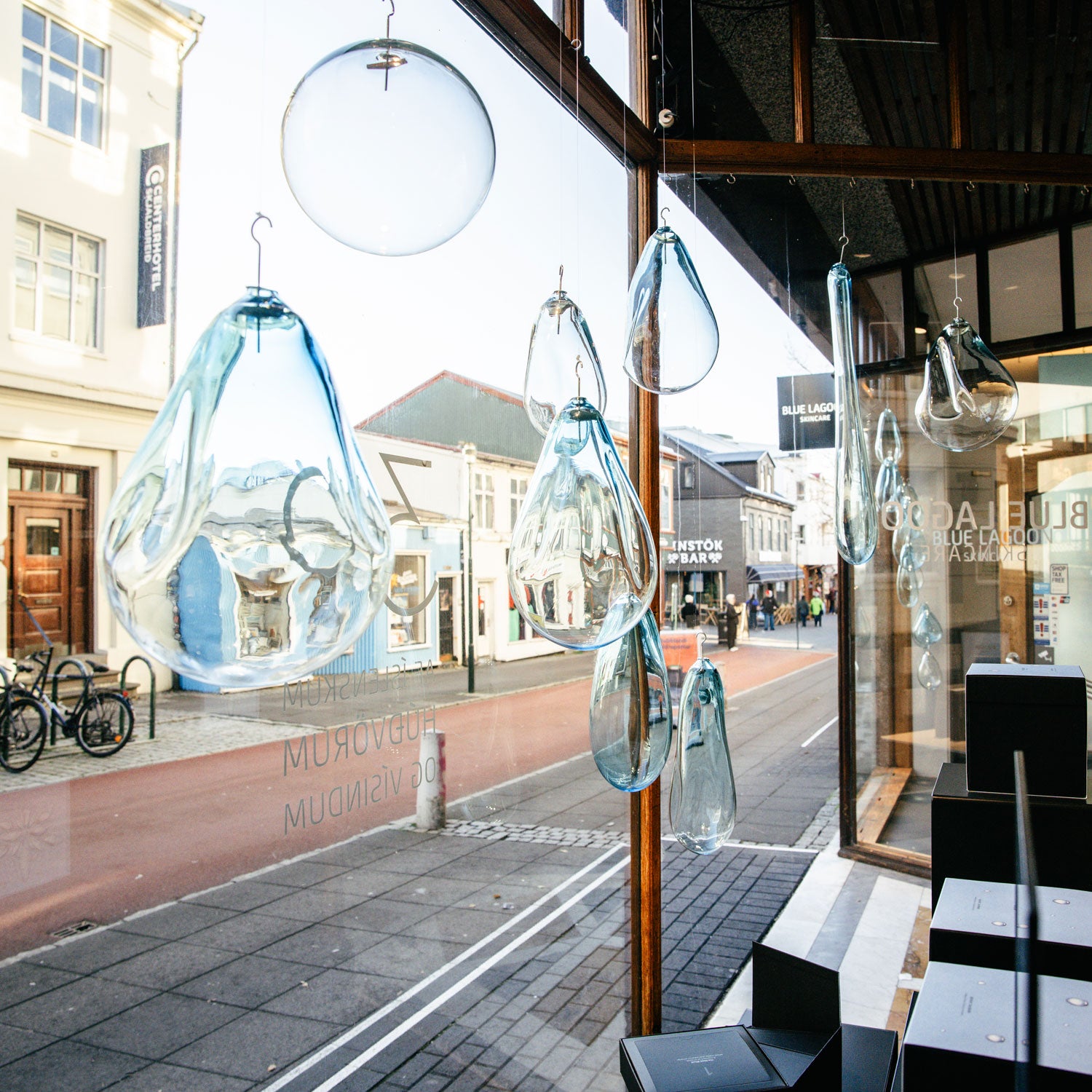 This holiday season, our “Drops of Wonder” campaign includes both small gestures and grand treasures, all beautifully wrapped and ready to help you share the wonder of the season with your loved ones. To bring the campaign to life across our stores, we enlisted Icelandic industrial and product designer Sigga Heimis to interpret “Drops of Wonder” into festive window installations. The delicate glass droplets capture both the magic of the season and Iceland’s elemental beauty, taking inspiration from many aspects of the Blue Lagoon’s legendary bioactive waters. In this conversation, Sigga shares the story behind the project and how her love of glass and our star ingredient influenced her creative process.