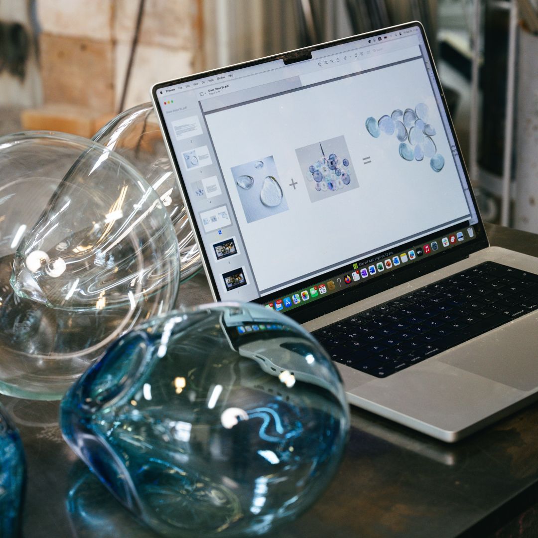 As for the process, we used a very ancient and basic technique. Glassblowing is like blowing up a balloon, although that’s an oversimplification because there are so many things that happen before, during and after. Because the glass is extremely hot, it’s all about timing. You have to pick up the glass when it’s the right temperature, then wait, pick up some more glass and blow into it. Then you have to wait until you can form it. At the end, you take the shape you have made — in this case the droplets — and put it into a kiln to cool off. So yes, it looks simple, it sounds simple, but it’s not simple at all. It’s a very delicate process and you have to be extremely careful with the heating and the timing.
