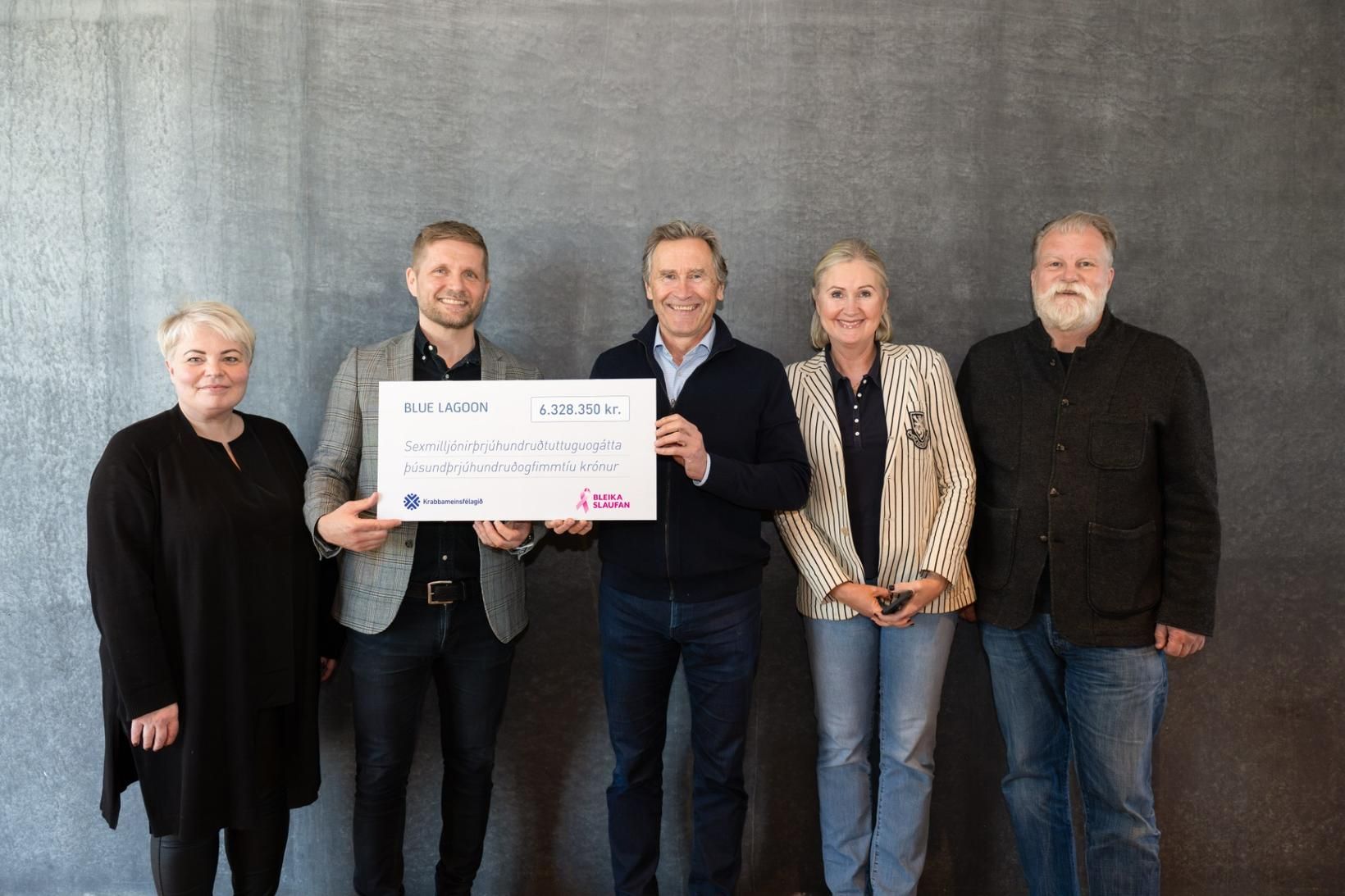 Grímur Sæmundsen (center) CEO of Blue Lagoon Iceland, Helga Árnadóttir (second from right) Managing Director of Blue Lagoon, and Sigurður Þorsteinsson (far right) Director of Branding, design and innovation at Blue Lagoon, delivered a check for a record amount to the Icelandic Cancer Society Research Fund in 2023.