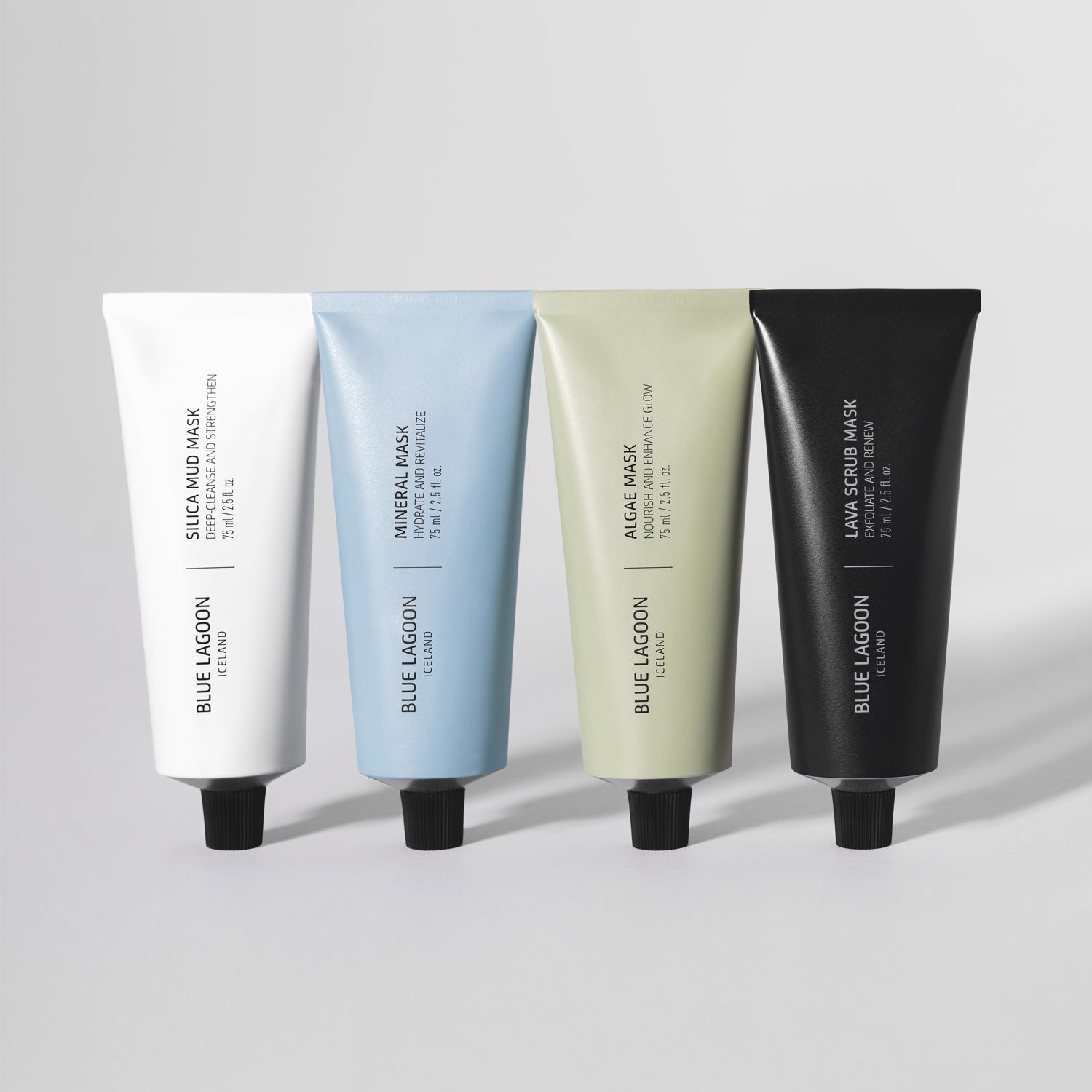 A gift box featuring all of Blue Lagoon’s iconic bioactive face masks. The set contains: Silica Mud Mask (75 ml), Algae Mask (75 ml), Mineral Mask (75 ml), and Lava Scrub Mask (75 ml).