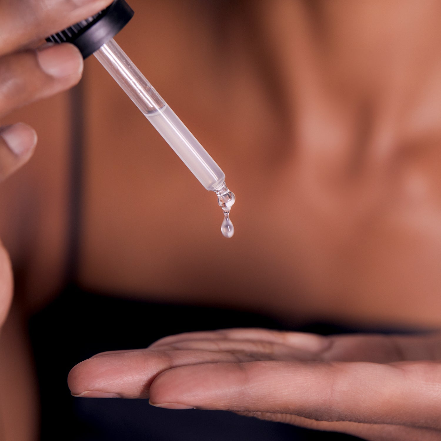 - With any remaining serum, gently press onto the neck and décolleté with a light massage upward.