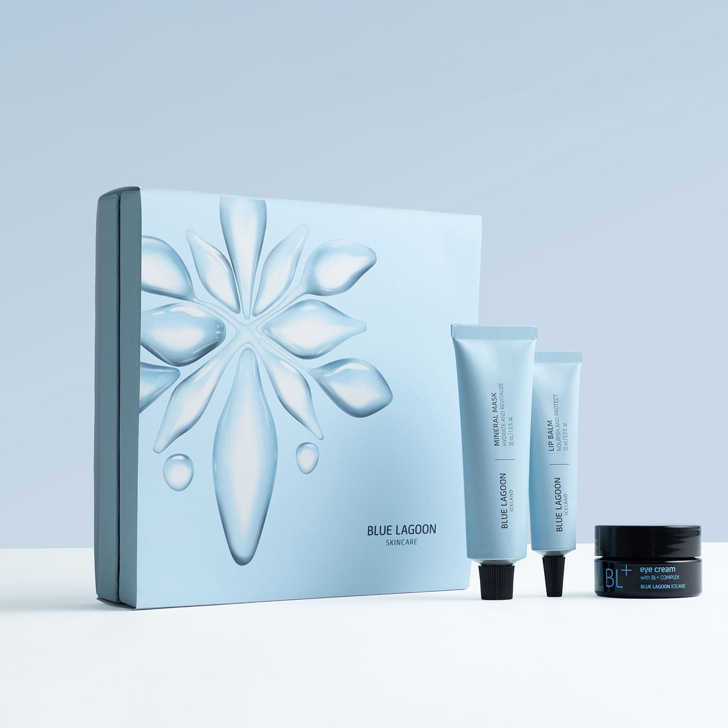 The set contains: BL+ Eye Cream (15 ml), Mineral Mask (30 ml), and Lip Balm (10 ml).